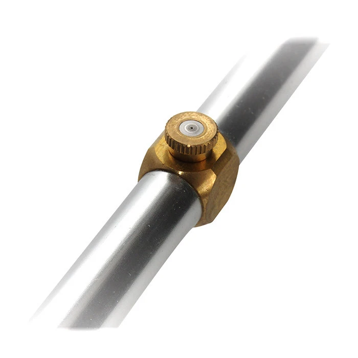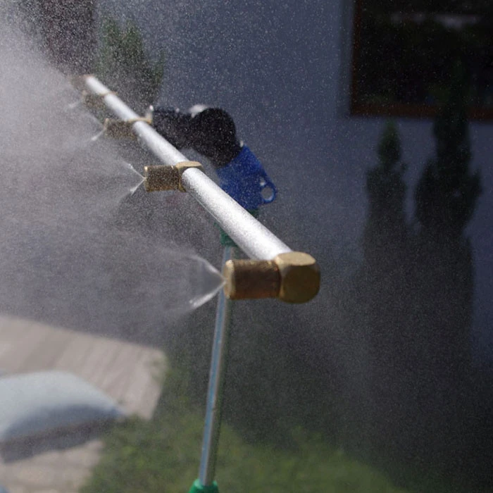 La rampe de brumisation est équipée de 5 buses en laiton et d’un connecteur rapide au tuyau d’arrosage. Le temporisateur intermittent est compatible avec ce produit ce qui vous permet de définir une fréquence de brumisation.
