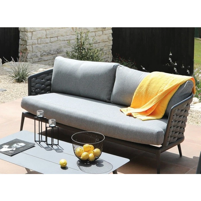 Pour vous accueillir dans un confort total, votre salon de jardin Tim est composé de structures en aluminium pour les sièges (canapé et fauteuils) et la table.